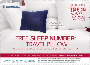 Free Sleep Number Travel Pillow “Like” their Facebook page to print the coupon, then bring in store for a free travel pillow. Expires 4/27. Free Sleep Number Travel Pillow No related posts. Sign up for our daily newsletter and never miss a deal again! As a subscriber, you'll be the first to know about new offers and discounts on SweetFreeStuff.com! Enter your e-mail: